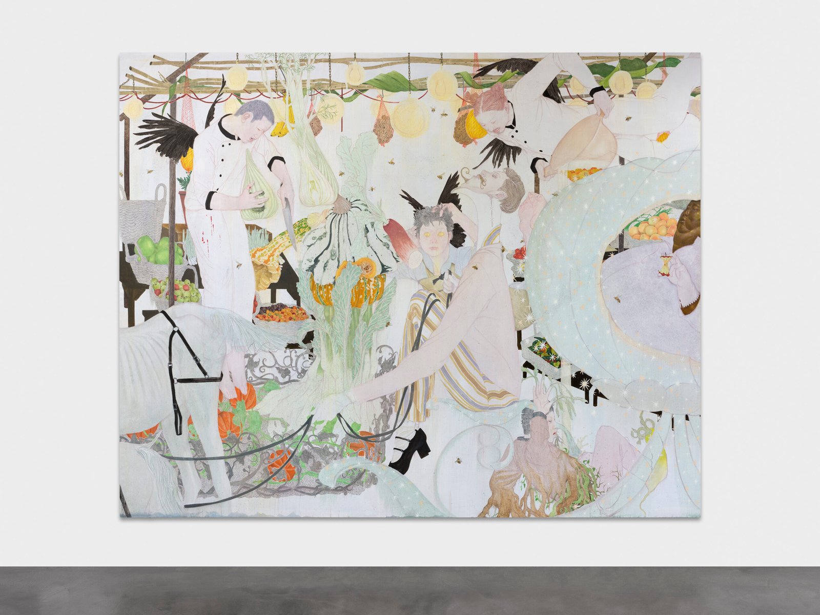 Nothing fully resolves. Figures collide, gestures remain suspended, meanings circulate without stabilising. The works suggest a condition in which images accompany experience rather than explain it, multiplying alongside it. What emerges is a dense visual field where recognition and disorientation coexist, and where the search for coherence becomes part of the image itself.