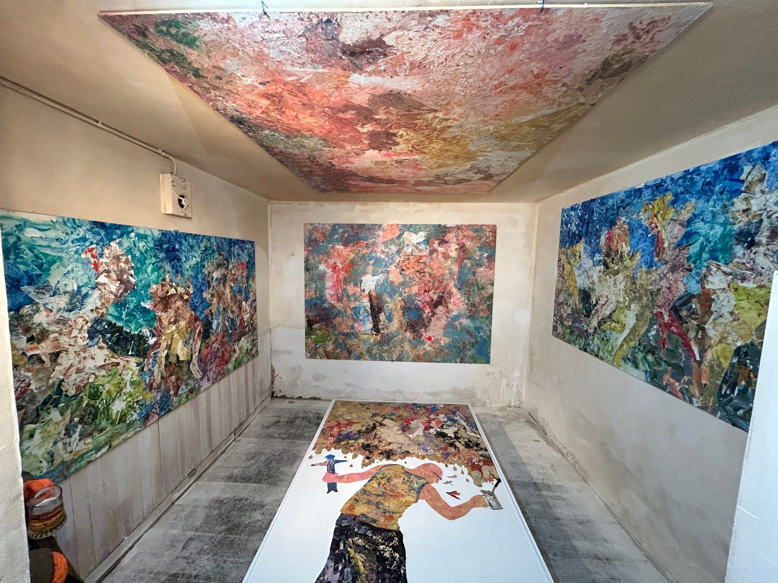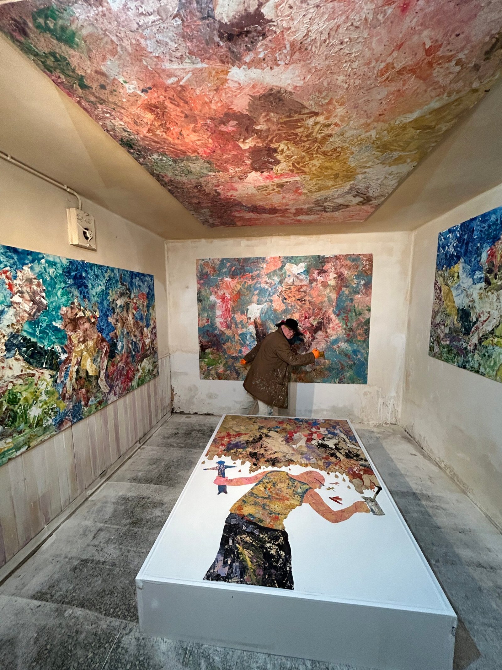 The artist, wearing his stained, old coat, standing in the space, functions as a condensed trace of this process. He keeps the signs of effort without turning them into symbols, allowing the body to remain present through what he leaves behind.